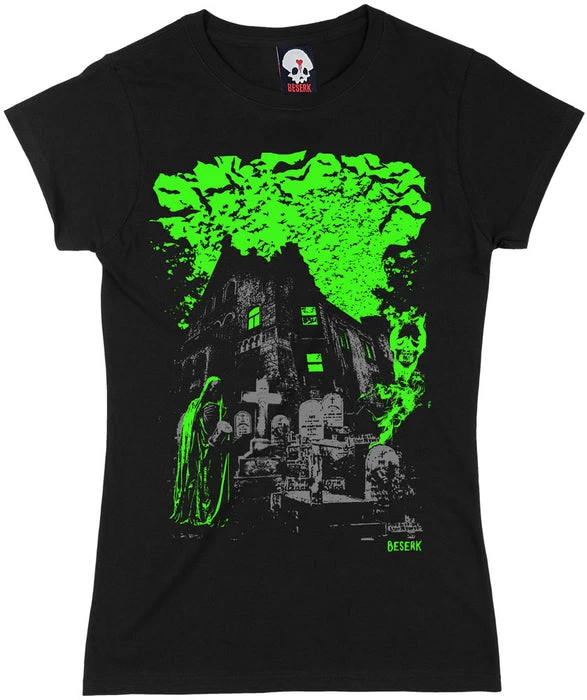 This fierce Tee features a creepy haunted house with a swarm of bats, perfect for your dark wardrobe!