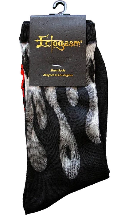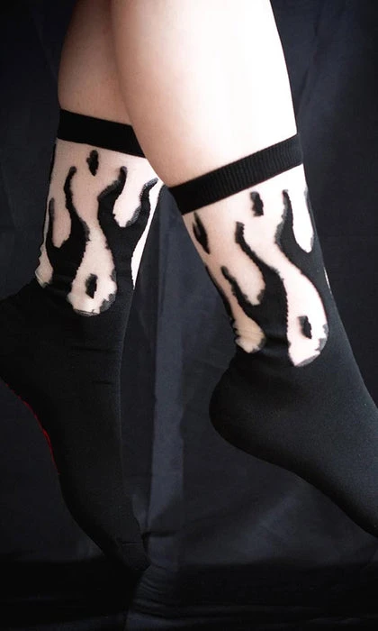 These cool socks feature a wicked black flame pattern. Woven over a sheer base, when you wear them, it looks like flames are coming out of your shoes! Wear with your favorite sneakers or boots for a unique alternative aesthetic.