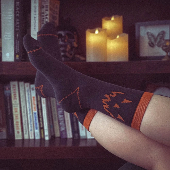 These pumpkin socks are perfect for Halloween spirit! Features an orange jack-o-lantern face on dark gray. Orange stitching completes this haunting style.