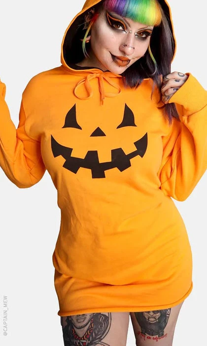 The Haunted Hallows Jack O’ Lantern hoodie dress is the perfect combination of comfy and spooky for either a cozy night in or a fun day out.