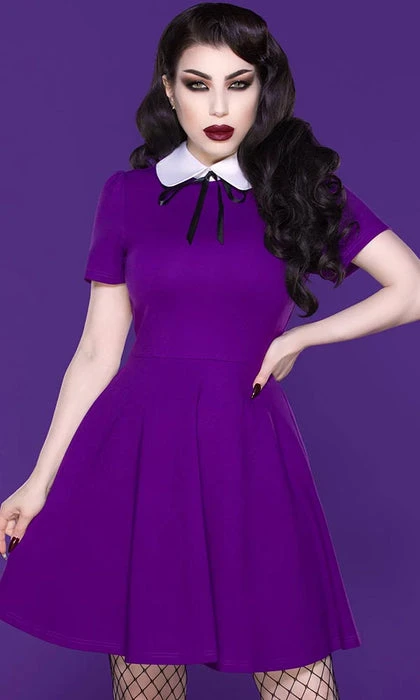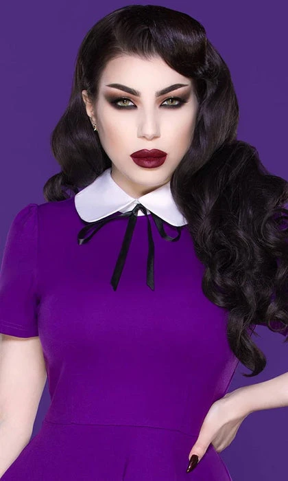 Introducing the classic Hayley Skater Dress in magnificent purple! It’s a classic shape with a cute peter pan collar in contrasting white with a black ribbon bow for added charm. The flared skirt is hemmed approximately at the thigh and it fastens with a hidden zipper at the back. Made from a four- way stretch Ponte fabric which keeps its shape and drapes beautifully.