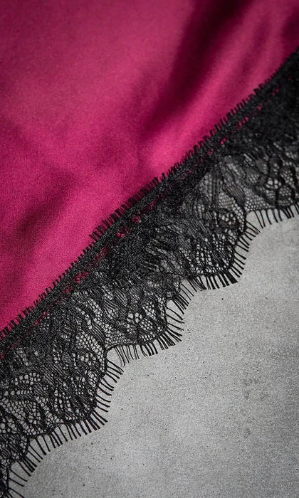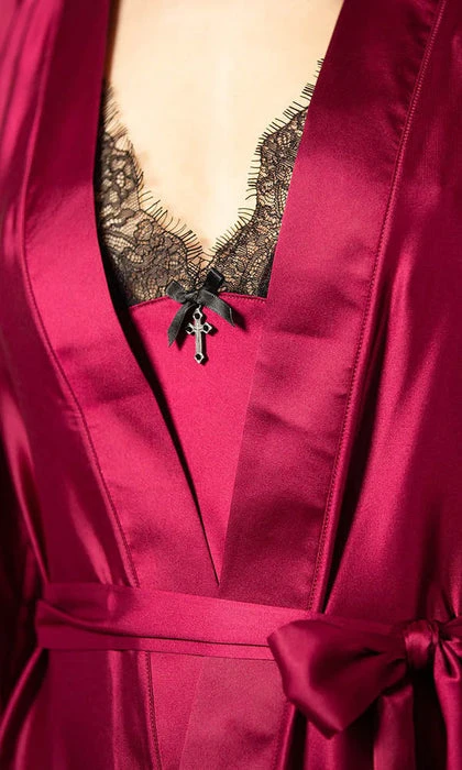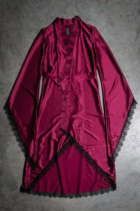 Add some dark glam to your adventures with the ‘Deadly Daze’ satin robe – in a super soft fabric, with statement waterfall sleeves, open front, and lace tie. Decorated with delicate lace trims, all black on black, of course. A seductive must-have – pairs beautifully over lingerie sets or just your birthday suit.