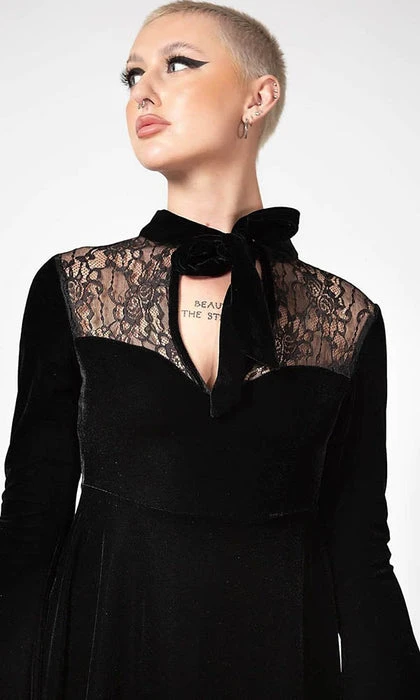 Become draped in darkness with the ‘Grimina’ Velvet sorcery dress. Crafted in super soft, stretch velvet with a delicate lace neckline detail and finished with a keyhole neckline and velvet neck tie closure. Finished with XL statement bell sleeves with a batwing hem.