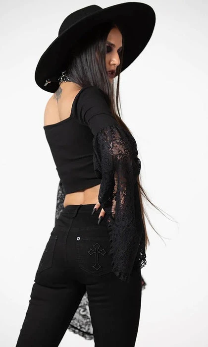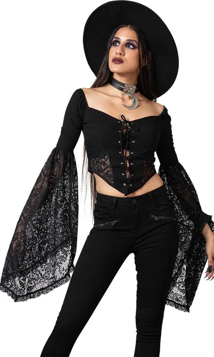 – Flowing, lace bell sleeves.