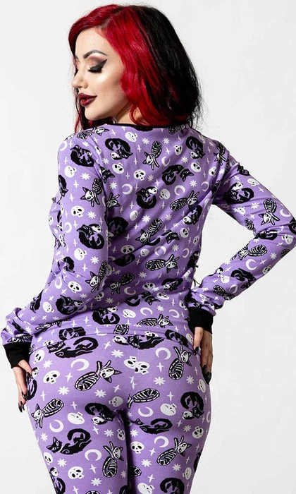 Lounging in your coffin watchin’ Netflix is the life! The ‘Purr Off’ long sleeve top is perfect for lazy days, sleep-overs, naps and movie marathons. Made in a stretchy soft fabric for perfect comfort and fit, featuring a contrast print all over, long sleeves with contrasting cuffs and a round neck.