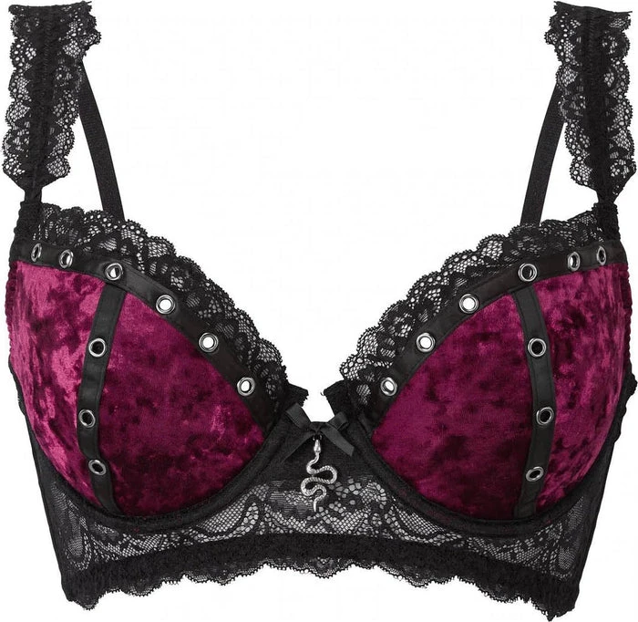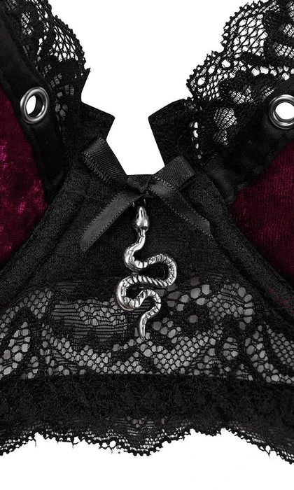 Turn pain into power and seduce in the ‘Sacred spirits’ velvet bralet. Crafted in soft, velvet fabric with delicate lace trim it’s finished with a metal snake charm. Perfect for seducing the demons or making yourself feel fierce.