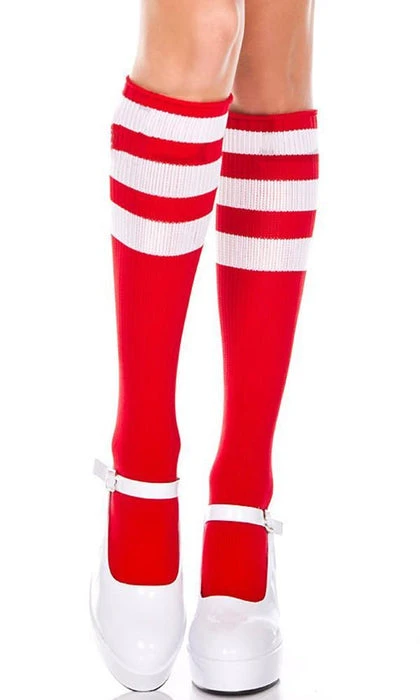 These Red and White Triple Stripe Knee High Socks from Music Legs are vibrant, cute, and super sassy. Stomp the damn yard!