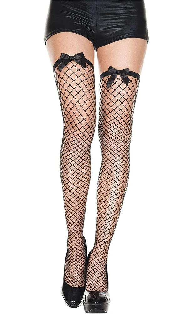 These sexy mini diamond net thigh high stockings feature cute bow accents and pair perfectly with matching lingerie or with any costume!