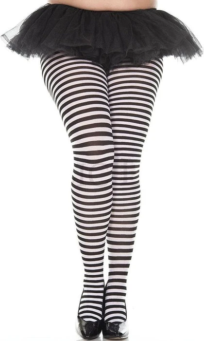 These Black and White Tights from Music Legs are the perfect addition to your next Costume, Cosplay, or Gothic Punk Outfit. Featuring small horizontal stripes and bold lines, these opaque tights are not for faint-hearted!