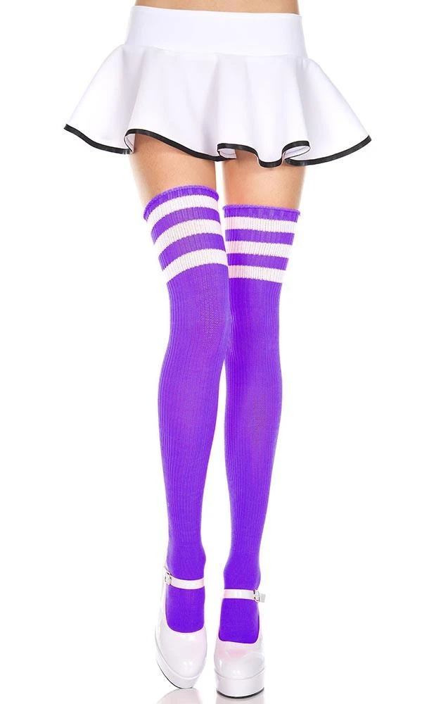 The Athletic Striped Purple and White Thigh Highs by Music Legs are the perfect addition to any outfit, costume, or cosplay. These thigh highs feature white stripes at the top on a Purple background.