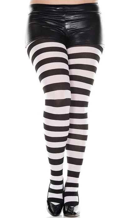 These Black and White Tights from Music Legs are the perfect addition to your next Costume, Cosplay, or Gothic Punk Outfit. Featuring bold horizontal stripes, these opaque tights are not for faint-hearted!