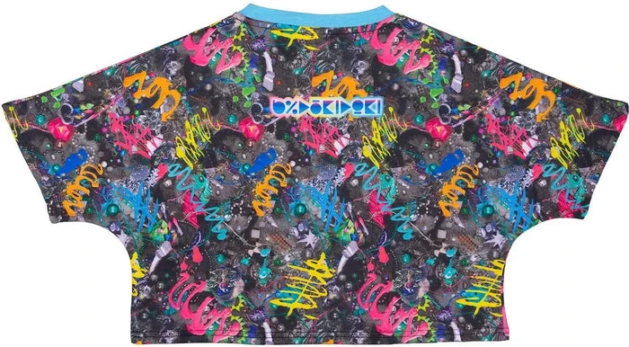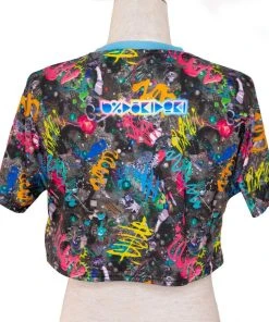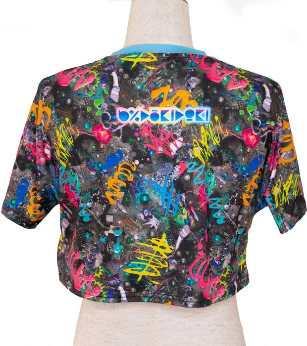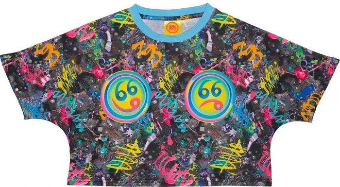 This Kawaii Cropped Mini Tee includes iconic imagery from the rave scene; neon smiley faces arranged in a pop design.