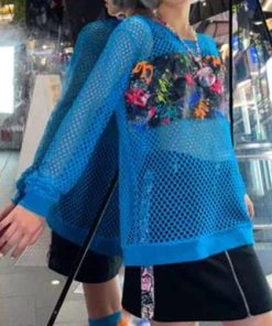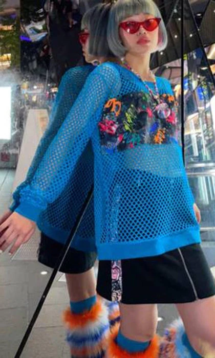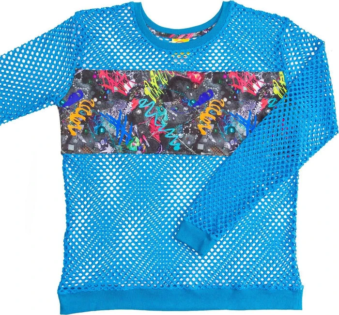 This Blue Mesh Top features an oversized fit, stretch fishnet, and ribbed cuffs and hem. Super comfy and stylish!