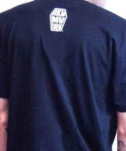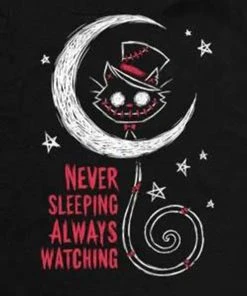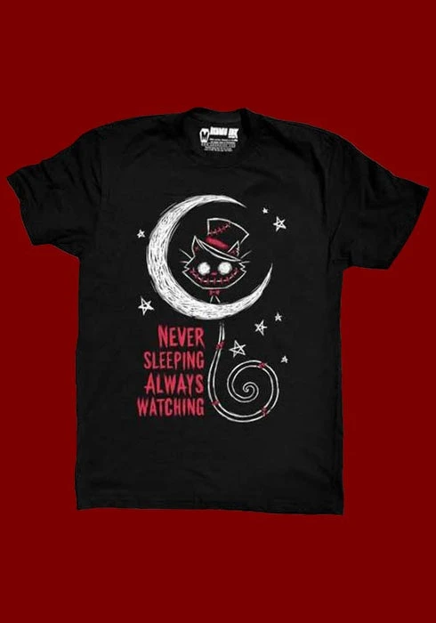 Original hand-drawn artwork of ALWAYS WATCHING, depicting a creepy Cheshire cat, who will never let you out of his sight, ever. With a coffin logo on the back near the neck like a signature on every shirt.