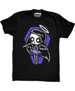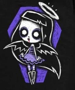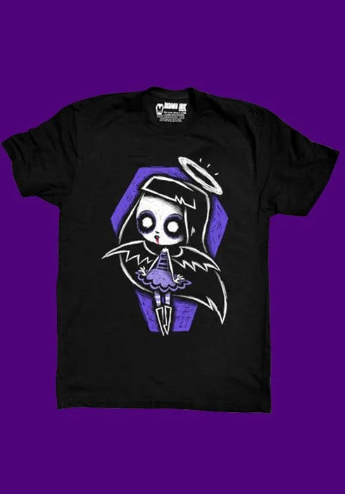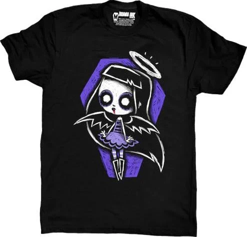 Original hand-drawn artwork of a not so innocent angel in front of a purple coffin shape.