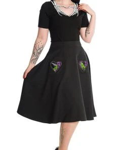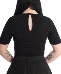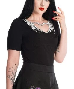 Do the dead have a hold on your heart? This black fitted shirt with a button up back will help you to show it. With a creepy skeleton print around the heart-shaped keyhole cutout, this black top looks great with a high-waisted skirt and an insatiable love for the dead.