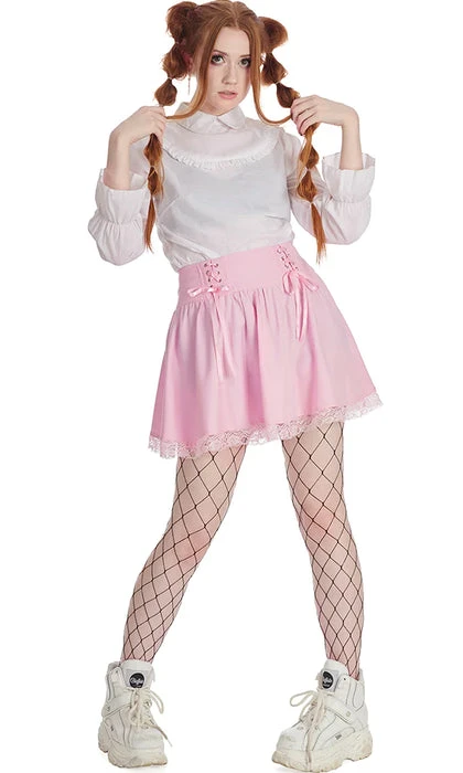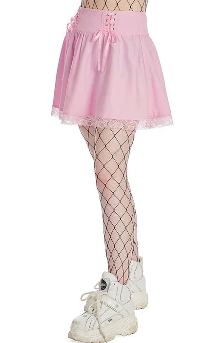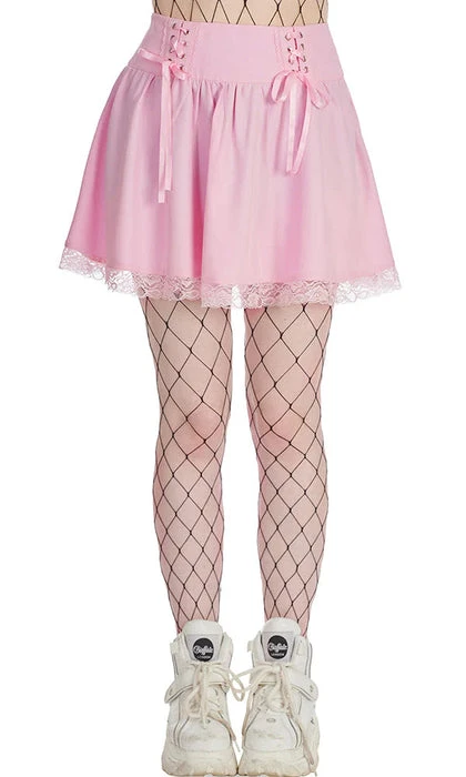 Calling all our pastel goth cuties, this flowy pastel skirt is perfect for every occasion. Featuring a corset lace up belt detail, and lace trim, it will look adorable paired with fishnets, a cute top and your go to boots.