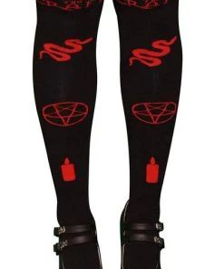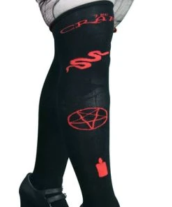 Blackout knee high socks with red contrasting witchy symbols! A total staple for your alternative closet! Pair these socks with a The Craft X Beserk t-shirt, a black pleated skirt and some converse to complete your looks with an effortless witchy vibe.