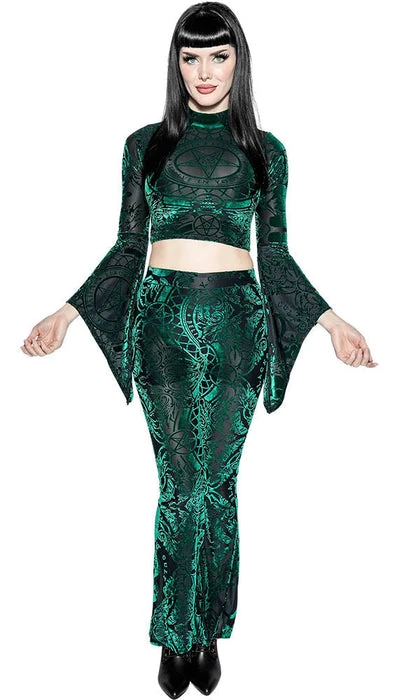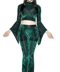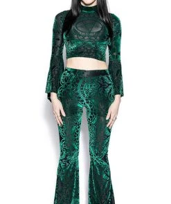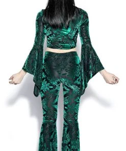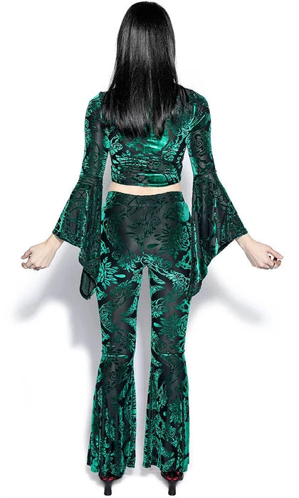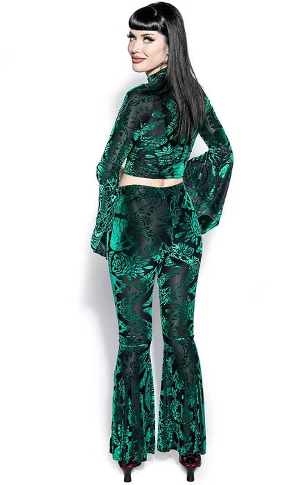 Stand out from the rest with the eye catching Green Baroque Velvet Flared Pants! Pair with a cropped top and heels for a perfect look for date night!