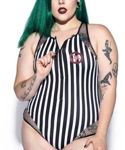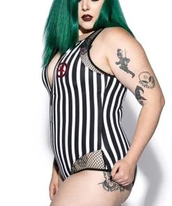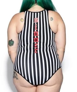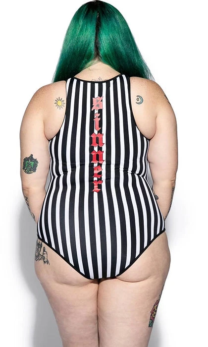 Deadly swimwear! Black and white stripes all over with red BIY logo and sinner print down back. This one-piece suit features sexy mesh accents around the shoulder and thigh, a zip-up front with gunmetal logo zipper, and removable padding.