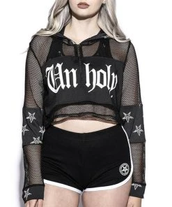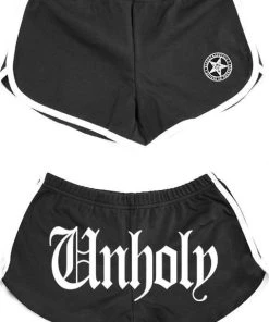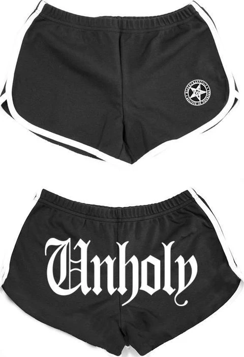 A deadly pair of short-shorts in all black and hemmed in a white trim, with “Unholy” text on the booty!