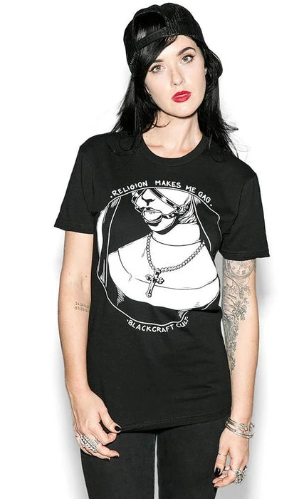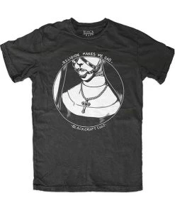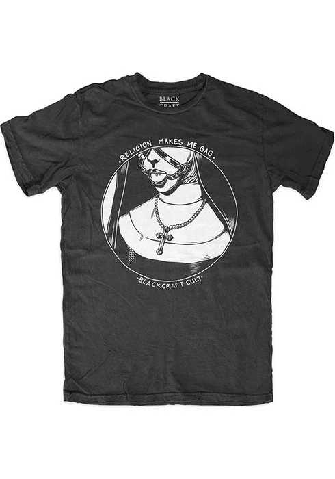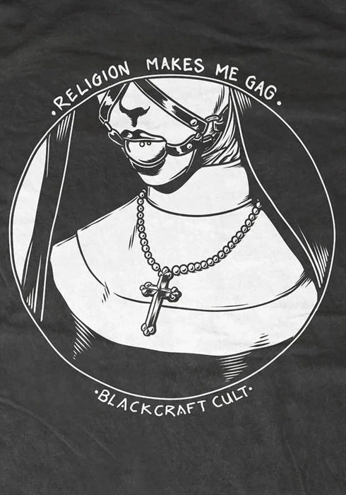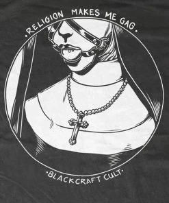 This comfortable shirt features a bondage style design of a nun wearing a ball gag with the text “Religion Makes Me Gag”.
