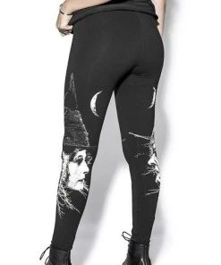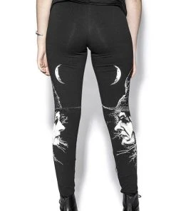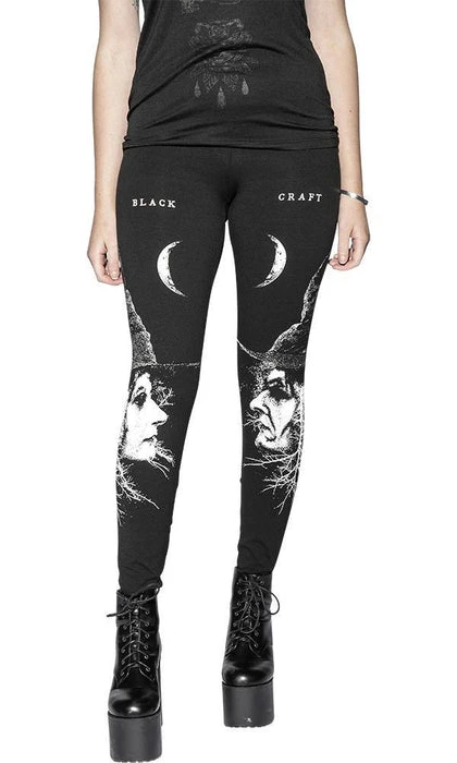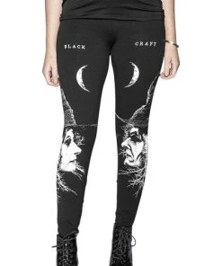 Looking for your next set of lethal leggings? These bad girls feature a soft water-based print of a pair of witches, the two alternate personalities in one, with simple crescent moons and the blackcraft logo over both legs.