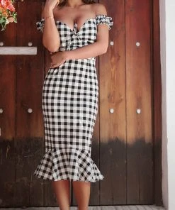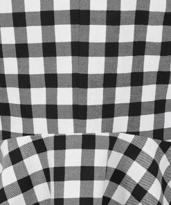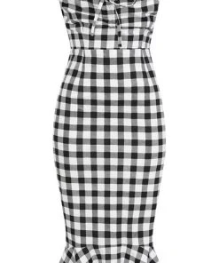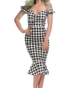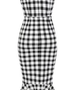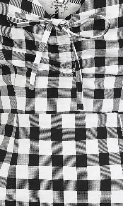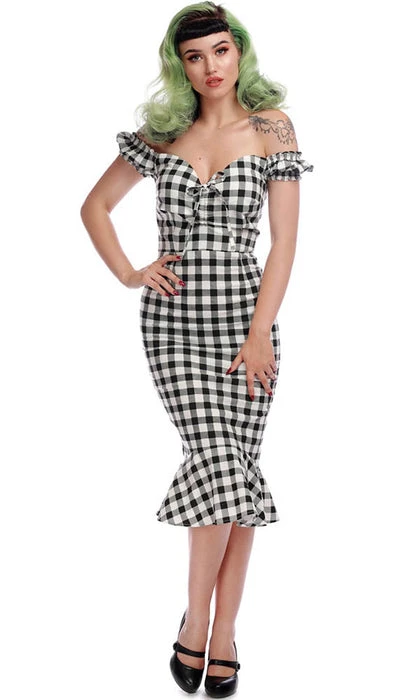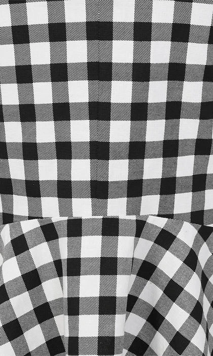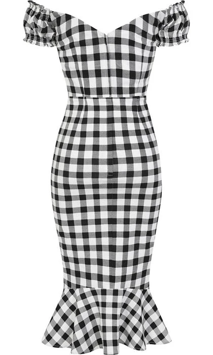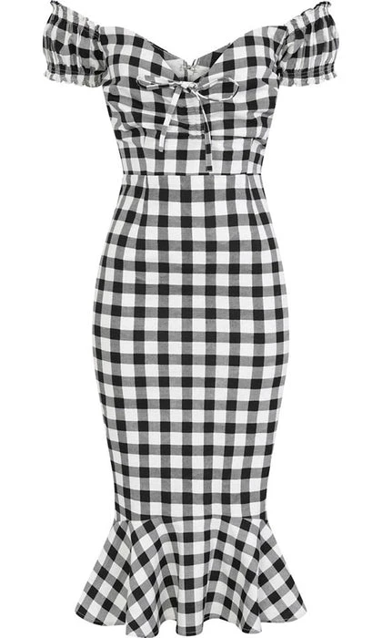 Channel sassy siren vibes with the Sasha Vintage Gingham Fishtail Dress. It’s a gorgeous summery piece, with a super flattering sweetheart neckline created by pulling the cord at the front of the bust – which ties into a neat bow. Because of this, you can decide how daring you wish the plunge neckline to be. It has elasticated off the shoulder Bardot sleeves, and a shaped V neckline at the back. Fits closely through the body to just above the knee, where it darts out into a striking peplum. Sasha is made from cotton with a slight stretch in classic black and white gingham, and fastens with a centre back zip. Pair yours with heels and a sparkly necklace for a gorgeous date night or fancy occasion look.
