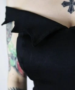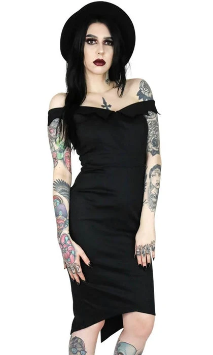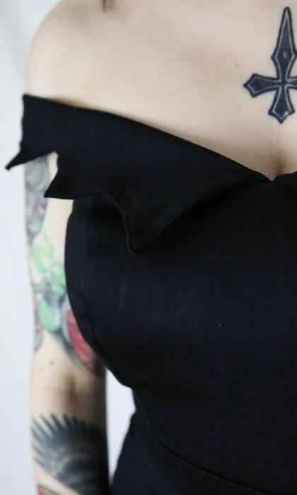 Halloween every day, we say! Unleash your inner Morticia with the Batwing Collar Wiggle Dress. Your staple little black dress has just had a unique update! The gorgeous off shoulder neckline features a fold-over batwing detail. With a classic slim fitted silhouette, the seamed waist is nipped in with a covered back zipper for a flattering hourglass fit. Team with a wide brimmed hat and cat eye sunglasses on sunny days for a classy gothic 50’s rockabilly look. Oh, and don’t forget the red lipstick!