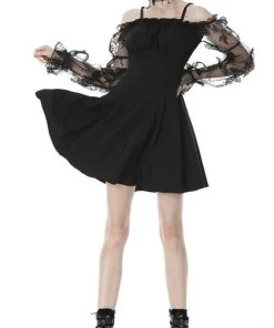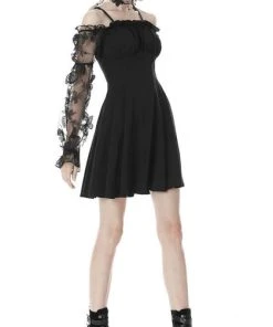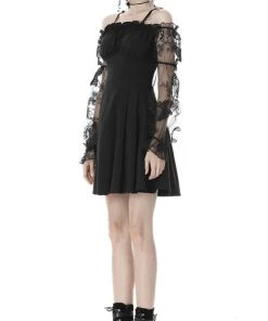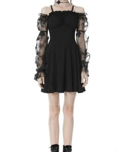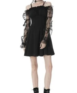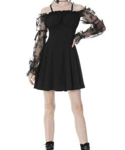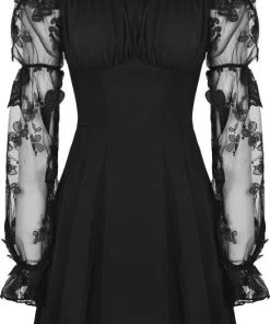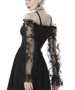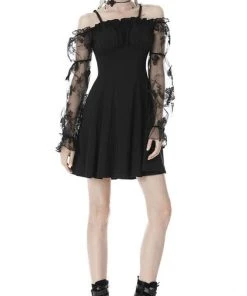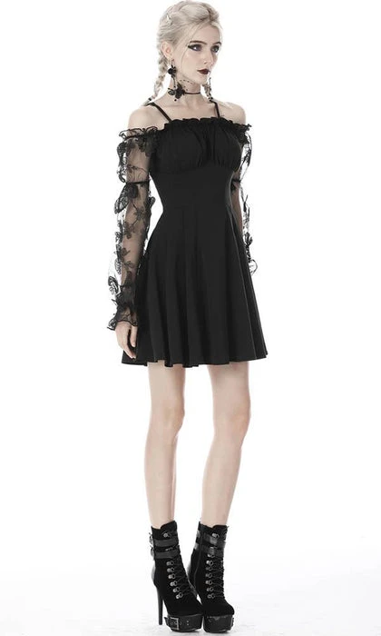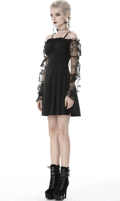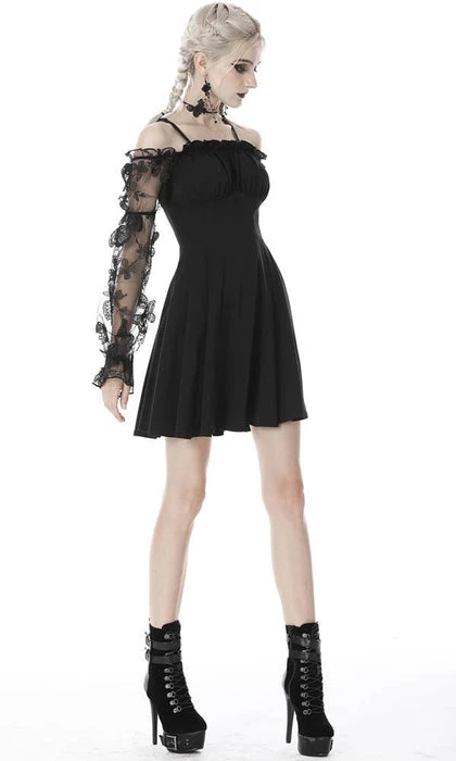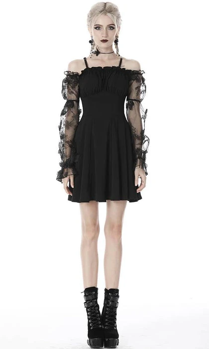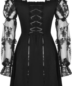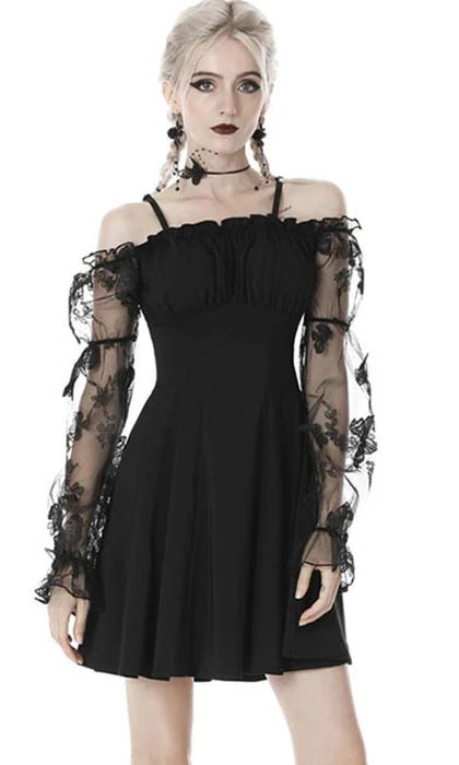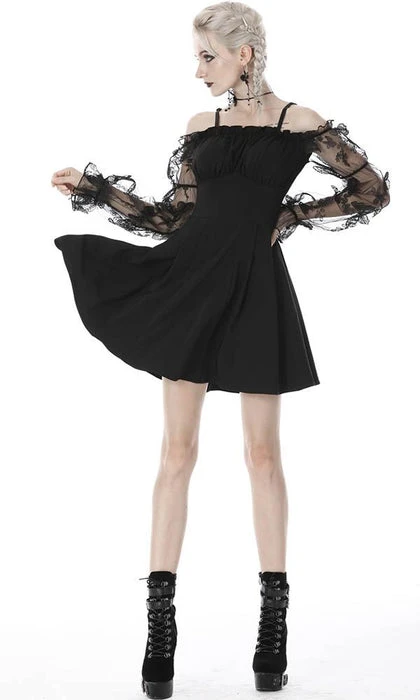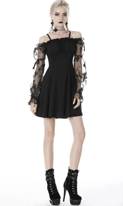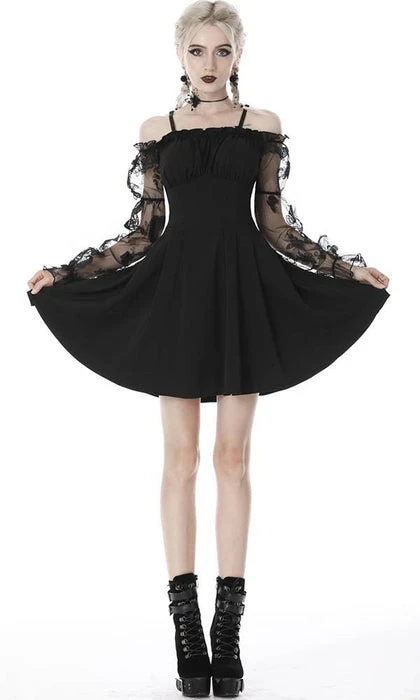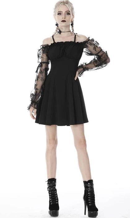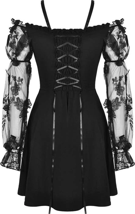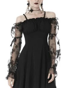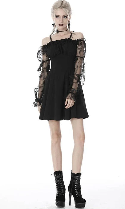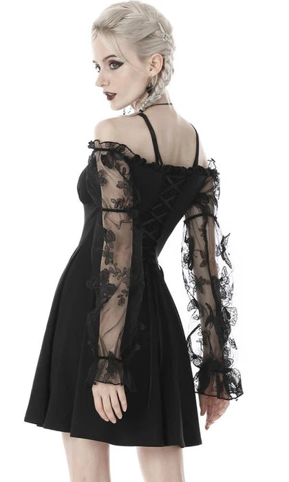 This beautiful Gothic off-shoulder dress features incredible mesh lace sleeves and a corset style back! This looks amazing with frilly ankle socks and heels or chunky boots and a high waisted belt.