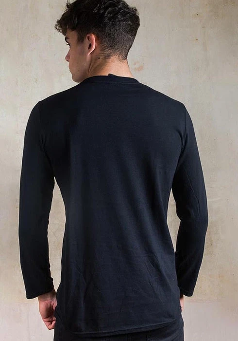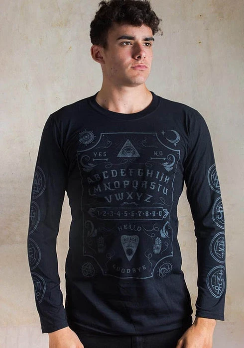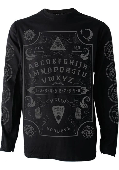 Hello and goodbye! This fine knit cotton long sleeve features all sorts of grey witchy Ouija motifs on the front and sleeves, perfect for the cooler seasons ahead! Pair this super soft t-shirt with a bomber jacket, bondage jeans and some big stompy boots!