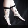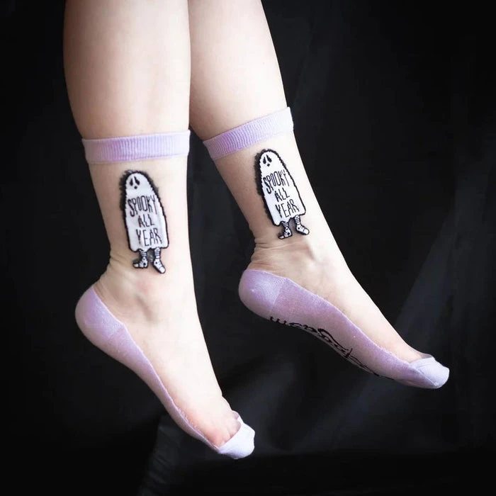 These Halloween socks are transparent with a pastel purple cuff, heel, and toe. The “Spooky All Year” ghost is woven on both sides of the sock for instant occult fashion.