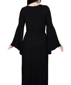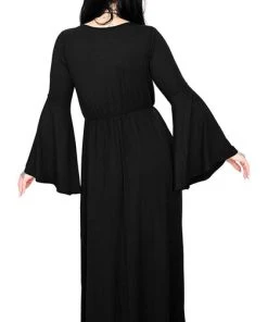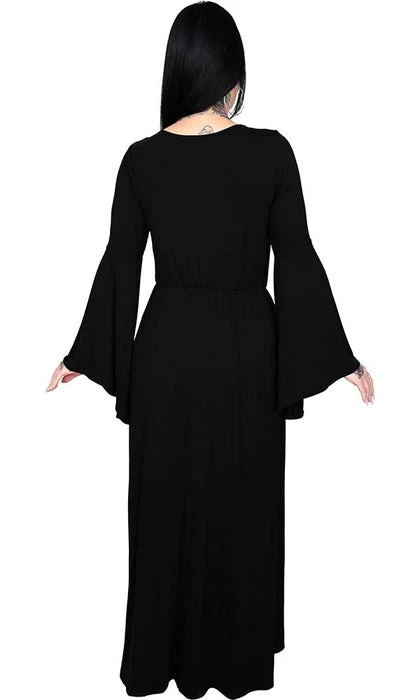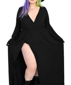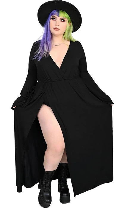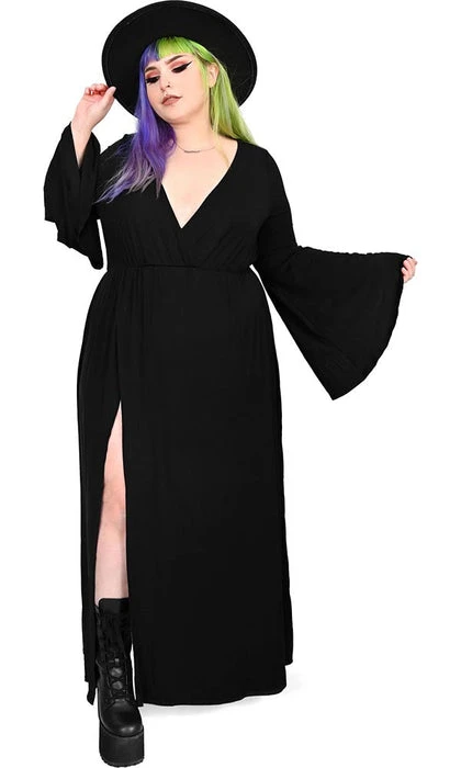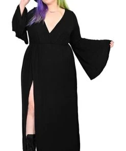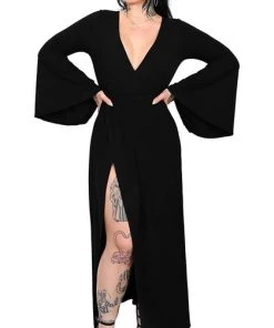 – Dramatic bell sleeve wrap top with deep cut V-neck line.