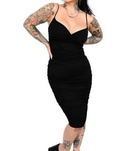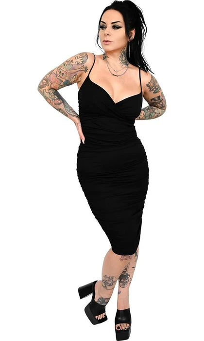 This gorgeous black bodycon is so soft and comfortable with a unique wrap front detail. Gathered side detail, to flatter your shape and hug all your curves.
