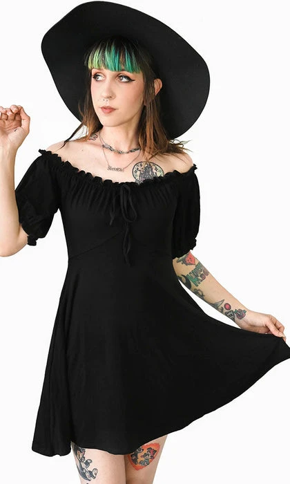 This black babydoll swing short dress can be worn on or off the shoulder… and, of course it has pockets!