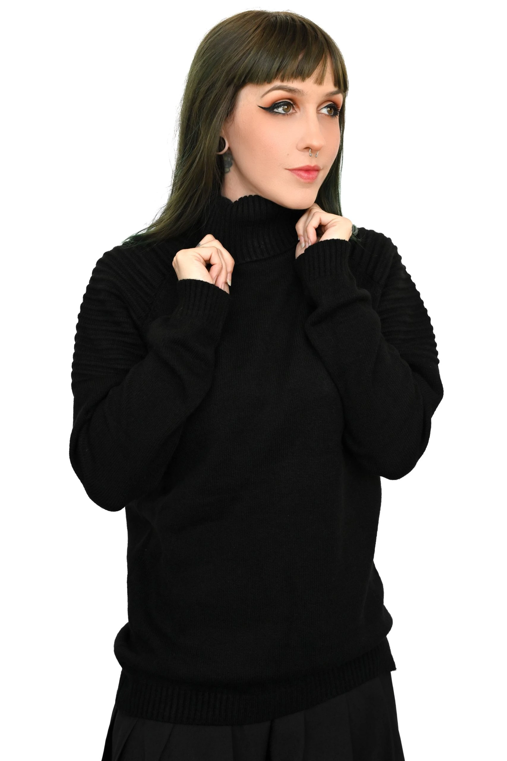 A black warm turtleneck sweater, with a unique ribbing detail through the upper arms and shoulders. Slim fit with some stretch. Cut with a little extra length, we love it with jeans or a mini skirt.
