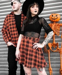 Foxblood designed this plaid top to match with the Pumpkin Patch Plaid Skirt, could be worn as a cute set, or to match your boo or best ghoulfriend.
