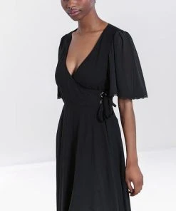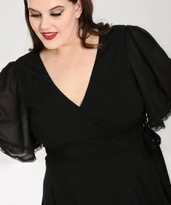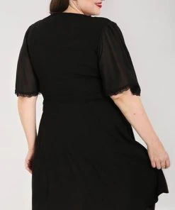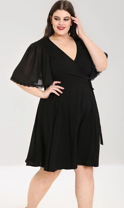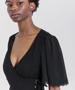 This little black dress for fellow witches and people who love black! Say hello to the Liara Dress! This stunning black wrap midi dress, that ties at the waist looks amazing on all! This dress framed by a low v-neckline and flared sleeves with delicate lace edging is so dainty and has a hidden grunge side with large silver eyelet detailing at the waist!