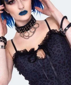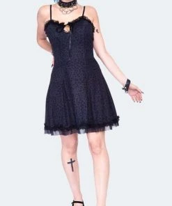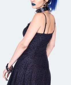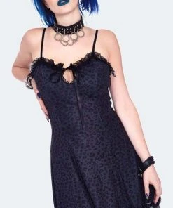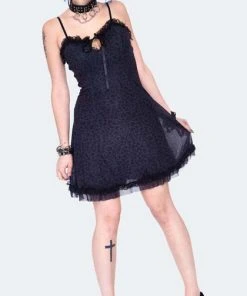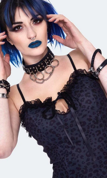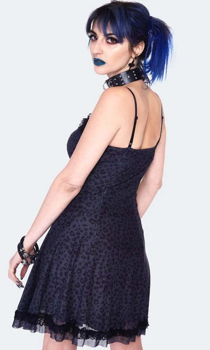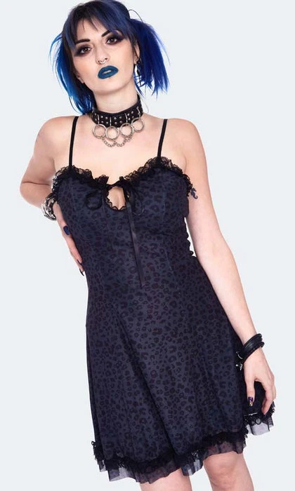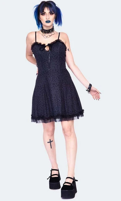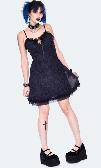 Unleash your wild side in this grey leopard babydoll dress. This super mini cami style dress has a peep hole cut out and lace ruffle trim to make even the tamest return to the wild. Pair with your favourite stompy goth boots or Mary Janes for a perfect summer goth look.