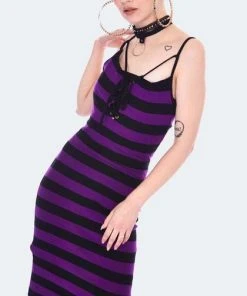 Knitted purple and black stripe mini dress with cross front strap detail, lace up bust and leg split. Create a killer look with some fishnets, your favourite statement boots and a choker.