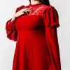 In dreams, we enter a world that is entirely our own. The ‘Evernight’ dress is a delicate and seductive statement piece perfect for a romantic day look. This dreamy dress is conjured using super soft velvet which stretches around the body for a comfortable and flattering fit. Fall in love with yourself in this lil’ gothic must-have complete with a high neckline, lace panel, capped sleeves and lace-up front.