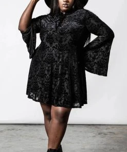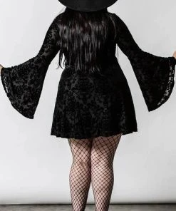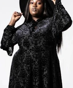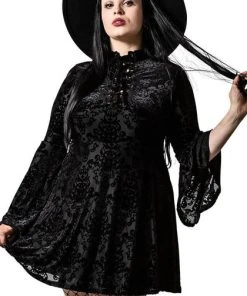 The night is young and full of mystery. Bewitch the ballroom and leave ’em wanting more in the ‘Lost Kingdom’ lace-up dress. Crafted using a burnout velvet fabric and structured in all the right places for a flawless fit. Killstar have pulled out all the stops – finished with a dramatic high neckline, lace-up detailing and long bell sleeves. A captivating gothic statement piece designed for you to dance from dusk til’ dawn.