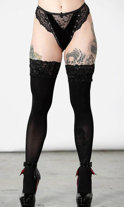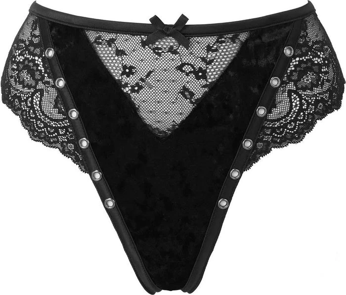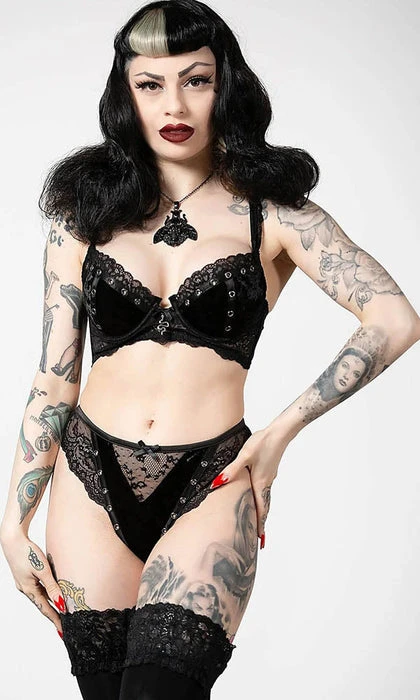 Turn pain into power and seduce in the ‘Sacred spirits’ panty. Crafted in soft, stretch velvet fabric with delicate lace trim and panels it’s finished with metal rivet details. Perfect for seducing the demons or making yourself feel fierce.