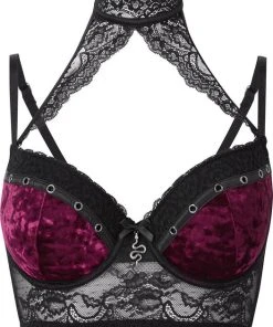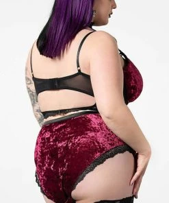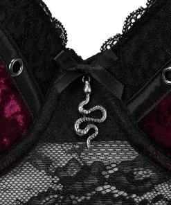 Make them beg for your attention in the ‘Mercy’ bra. Crafted in soft luxe velvet with lightly padded cups and adjustable, elastic straps for the perfect fit. Metal rivet details, snake charm and lace collar detail this bra is perfect for play dates with the devil, dancing barefoot under the moon or a coven sleepover.