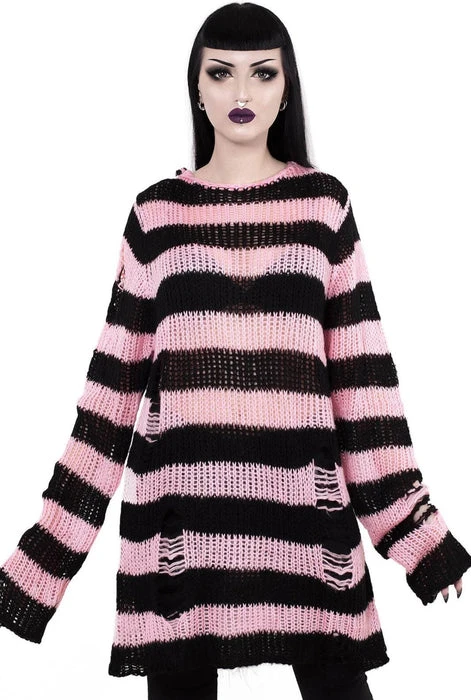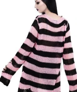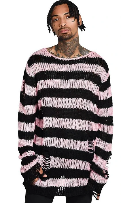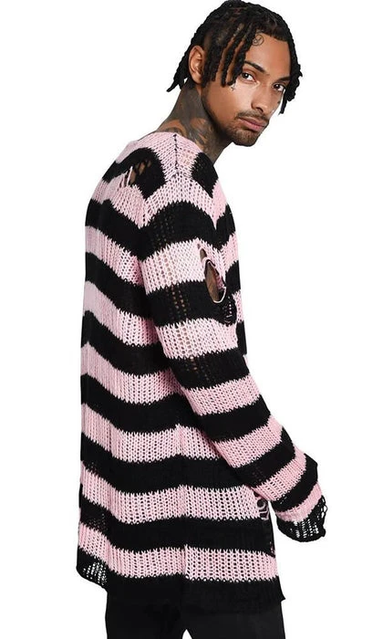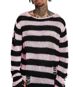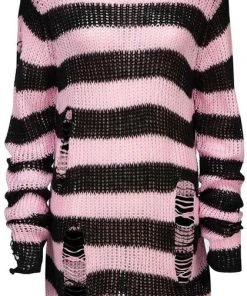 Channeling some 90s grunge with the ‘Bad Blossoms’ soft-knit sweater, perfect for layering – or wear as a statement piece. Contrasting black and muted-pink striped body; with extra long length so can easily be dressed up or down. With distress detailing and low neckline. Ideal for festivals, midnight promenades with the moon and hungover Sundays.