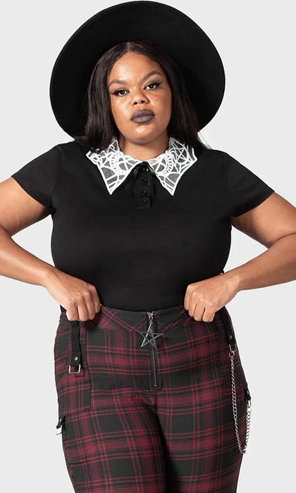 Stop em’ in their tracks by looking sinful in the ‘Apprentice’ collared top; conjured using a super-soft fabric which stretches to perfection for a body huggin’ fit. Complete with a statement lace collar, button up closure and ribbon detail, this goth staple is perfect for all wicked adventures.