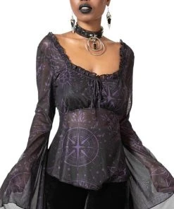 – Flowing bell sleeves.