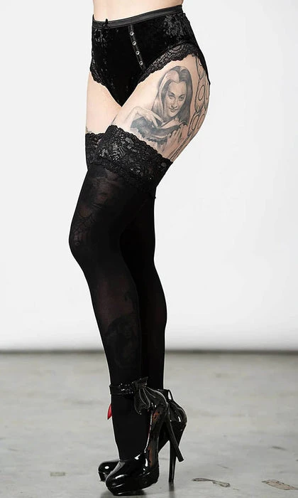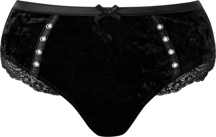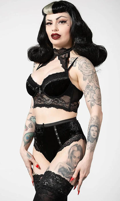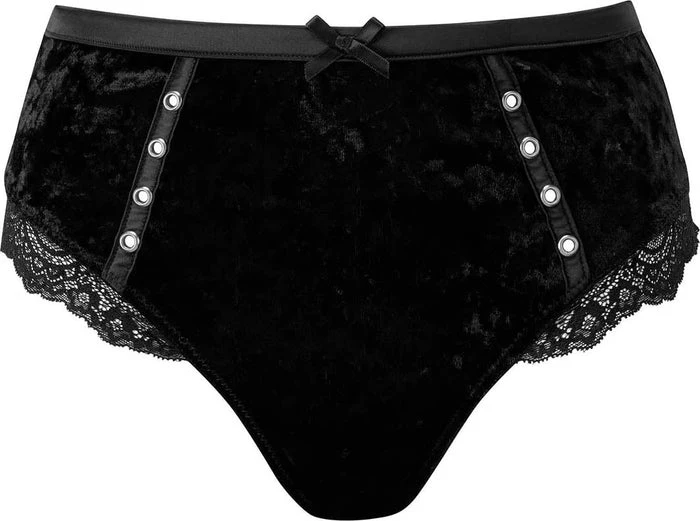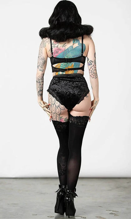 Make them beg for your attention in the ‘Mercy’ lace panty. Crafted in soft, stretch, luxe velvet with lace trim and finished with metal rivet details. Perfect for play dates with the devil, dancing barefoot under the moon or a coven sleepover.