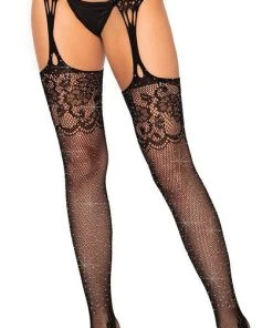Featuring glamorous rhinestones and feminine floral lace, the Yana Fishnet Stockings with Garter Belt by Leg Avenue is an eye-catching hosiery piece sure to catch your eye. These stockings come with an attached garter belt. Pair these with your favorite sexy lingerie set or a skirt and get ready to be a showstopper!