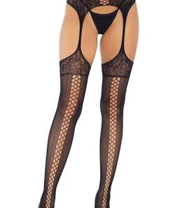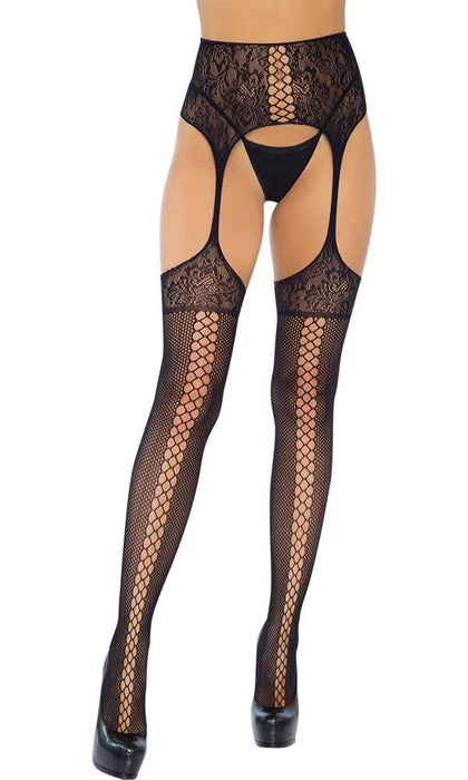 Get all caught up in the Sia faux lace up backseam fishnet stockings by Leg Avenue. This versatile hosiery look features a multi net design with the floral lace top and a high waist attached garter belt. Panty not included.
